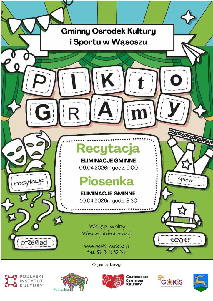 Gminny Ośrodek Kultury i Sportu w Wąsoszu zaprasza do udziału w Eliminacjach Gminnych VI Wojewódzkiego Przeglądu Amatorskiej Twórczości Teatralnej i Sztuk Wizualnych „PIKtoGRAmy” 2026. Przegląd ten jest prestiżowym wydarzeniem o randze wojewódzkiej, którego celem jest popularyzacja sztuki recytatorskiej i wokalnej oraz promocja młodych talentów z naszego regionu.