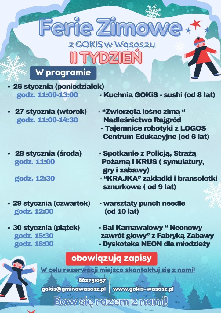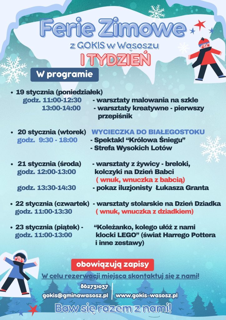 Gminny Ośrodek Kultury i Sportu zaprasza na ferie zimowe 2026 z GOKiS! W programie przygotowano wyjątkowe wydarzenia, w tym celebrację Dnia Babci i Dziadka.